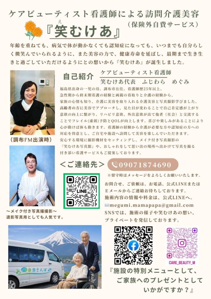 提携している保険外訪問看護の【笑むけあ】さん藤原恵さんはケアビューティスト看護師として東京さんぽのサービスをサポートしていただいており、旅行前に爪のお手入れやメイクをサポートしていただき、旅行の気分を盛り上げてくれます。